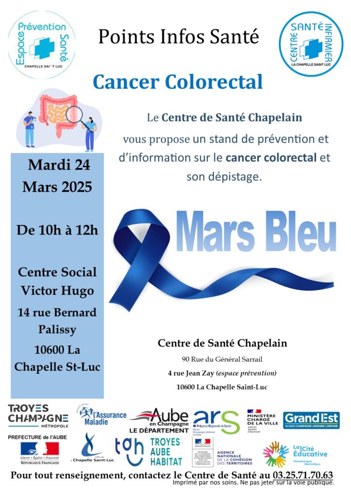 Dans le cadre de Mars Bleu, un équipe d'infirmière tiendra un stand d'information sur le cancer colorectal et son dépistage :
